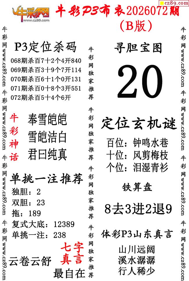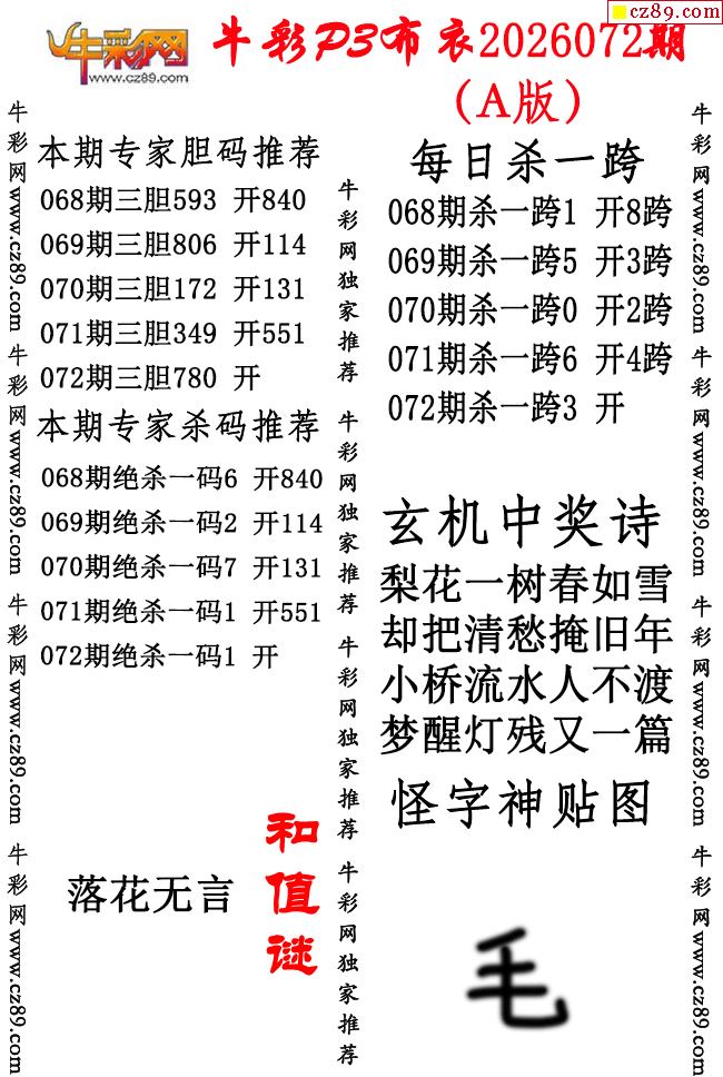 牛彩P3布衣26年072期AB版图谜(精华版)-3d试机号查询_今日3d试机号查询_福彩3d试机号今天_3d试机号口诀_今天3d试机号开机号-福彩网